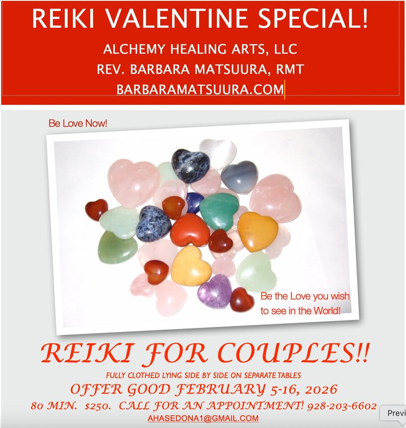 Alchemy Healing Arts Long Distance Remote Healings are always available. The remote long distance healings are especially helpful. Reiki and Qigong healings reduce anxiety and stress, bringing the recipient into a balanced state. I know it's hard to believe that these long distance treatments can work, but think about Quantum physics. When the intention to send Healing is made and the channel is opened for the Reiki energy to come through particularly for the person named and the person named intends to receive this Healing energy then the energies entangle and the Reiki energy is sent and received. This is not my energy. It is Reiki source energy from the Universe. At the end when the session is closed the energies disentangle. Long distance remote Healings are 30-40 min in duration. Date and time are set after payment is received. Usually the session is taking place as you go to sleep at night when you can completely relax. Or of course we can set it up in daytime. An email correspondence is sent the next day. Or if one desires at a designated time in the daytime. We can connect by ZOOM, or Facetime to talk before the session and then again after the session or an email communication. A single session can be reserved $85.