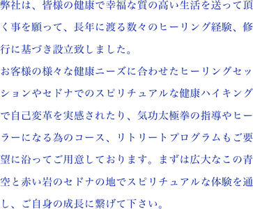 レイキヒーリングと同時にセドナのレッドロックをハイキングする時間の無 い方や、体力的に困難な方の為に、ボルテックスエネルギーをを持ったセドナの数々の石から選び必要な体の箇所に配置し、その石のエネルギー波動の 相乗効果も